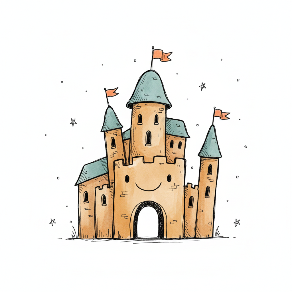 Niedliches, lächelndes Cartoon-Schloss mit Türmen und Fahnen in warmen Farben, umgeben von Sternen.