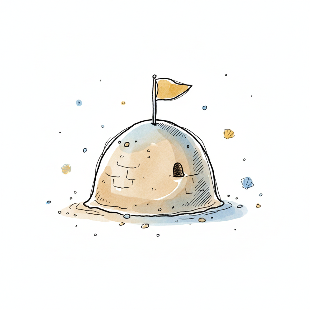 Niedliche Aquarell-Illustration einer Sandburg mit Fahne und Muscheln am Strand.