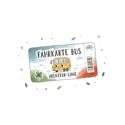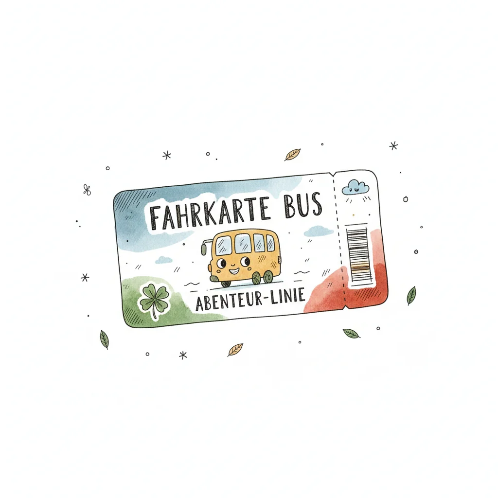 Bunte Busfahrkarte mit fröhlichem Bus, abenteuerlichen Motiven.
