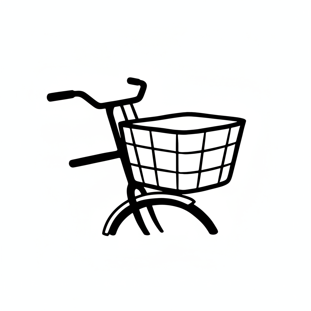 Schwarz-weiße Strichzeichnung des Vorderteils eines Fahrrads mit Lenker und Korb.