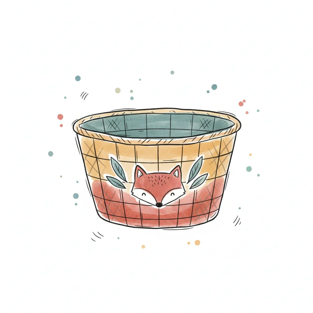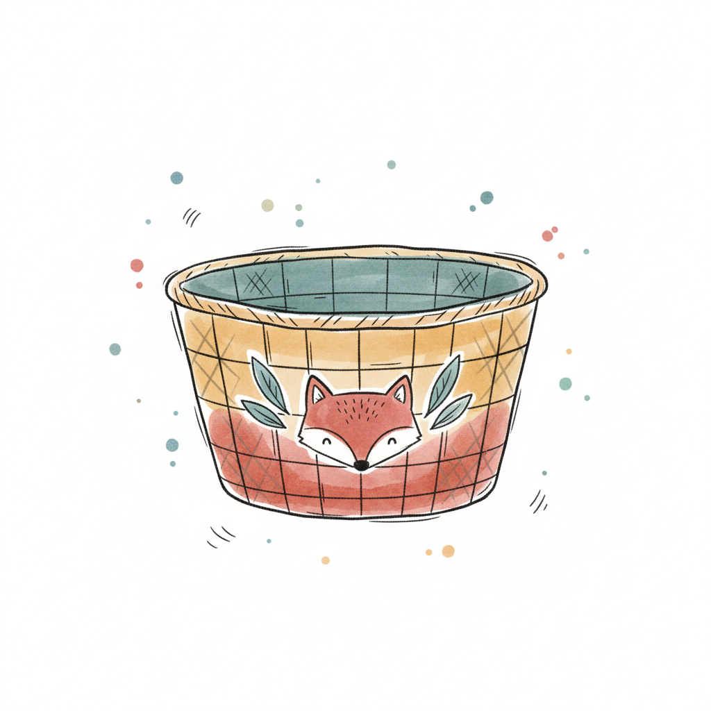 Niedlicher Korb mit Fuchsgesicht und Blättern im Aquarellstil, umgeben von Farbspritzern.