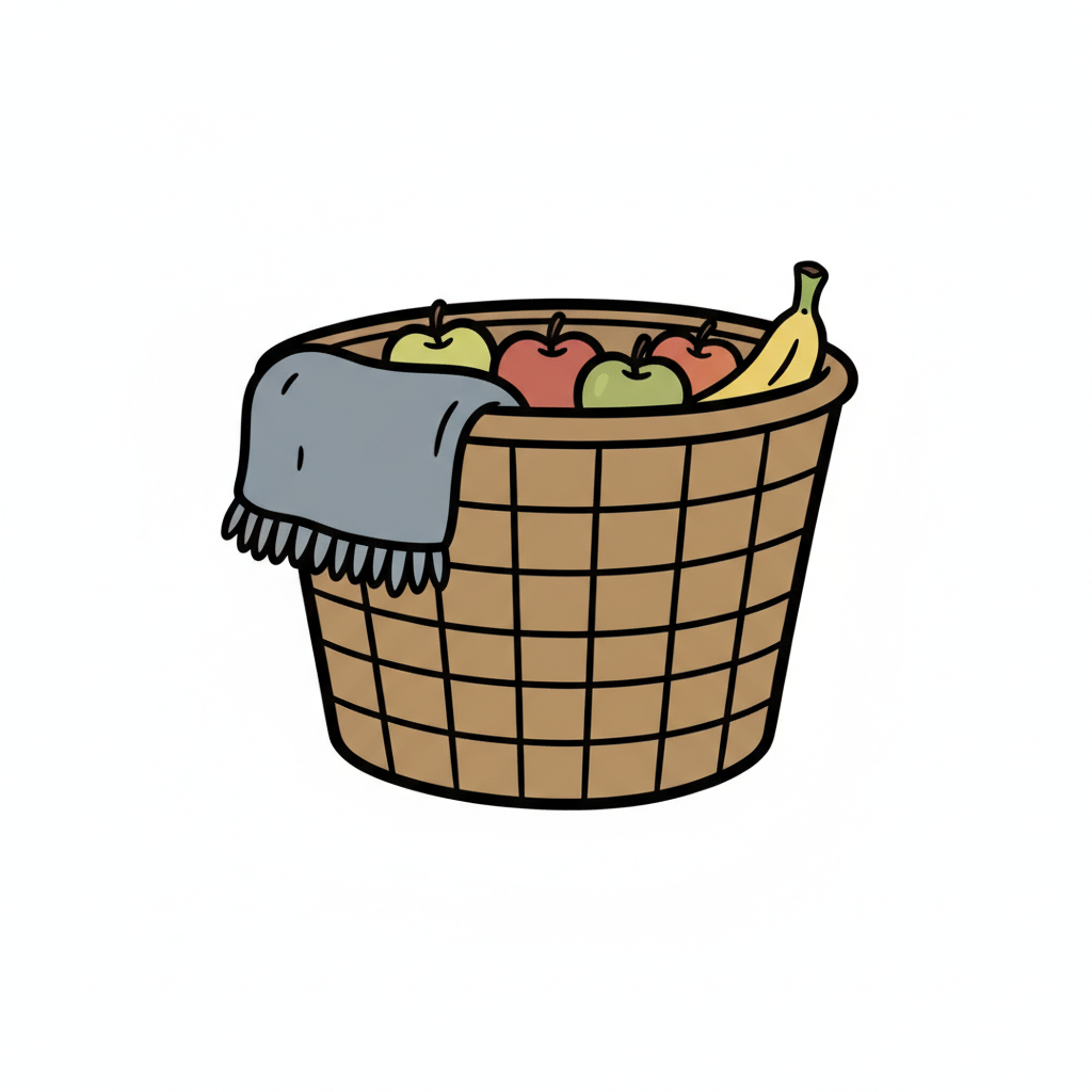 Cartoon-Korb gefüllt mit Äpfeln, Banane und einer grauen Decke.