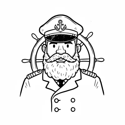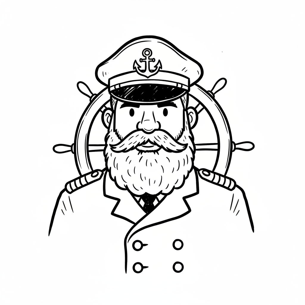 Karikatur eines Kapitäns mit Bart und Schiffsrad im Hintergrund.