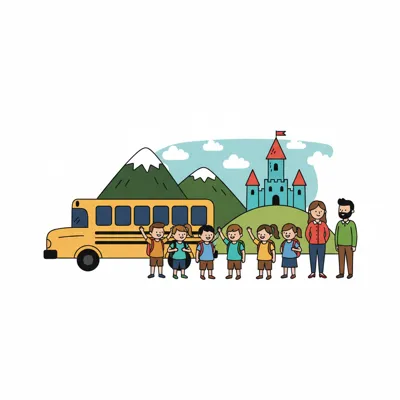Kinder, Lehrer und ein Schulbus vor Bergen und einer Burg.