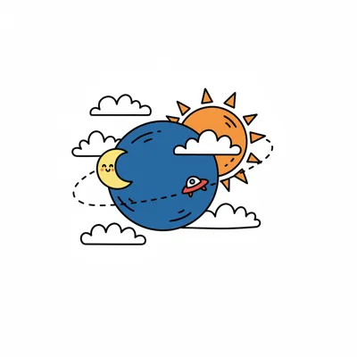 Ein Planet mit Sonne, Mond und Flugzeug umgeben von Wolken.