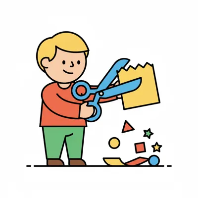 Ein Kind schneidet Papier mit einer Schere und lässt Formen fallen.