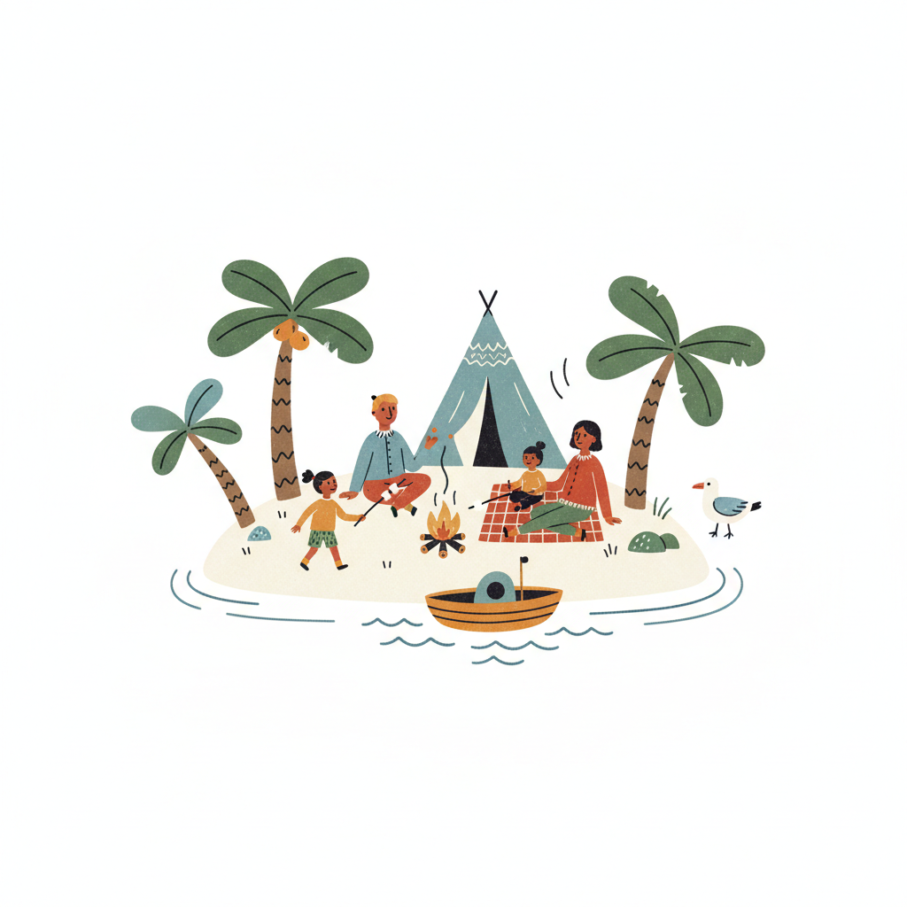Familie am Strand mit Zelt, Feuer und Boot, umgeben von Palmen.