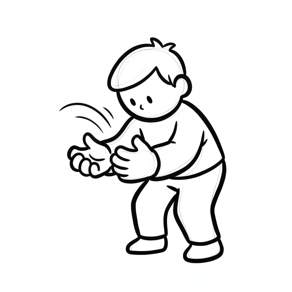 Niedliche, kindgerecht illustrierte Szene mit einem Kind oder einer Person als Hauptfigur, vor rein weißem Hintergrund, im frech-nordischen Aquarell-Skizzenstil. Klare, leicht wackelige Tuschekonturen, sichtbare Pinsel- und Strichtextur, dezente Schraffuren, weiche handgemalte Farbflächen in gedeckten Farben. Einfache, runde Formen. Keine harten Schatten, sondern sanfte, transparente Aquarellschichten. Leicht raue, handgezeichnete Linien statt glatter Vektorkanten. Subtile, vereinzelte Kritzelpunkte oder kleine Details im Hintergrund (wie Pünktchen oder feine Striche), aber keine echte Umgebung oder Landschaft. Die Figur ist mittig zentriert. Insgesamt charmant, humorvoll, warm und handgemacht wirkend. WICHTIG: Das Bild darf ABSOLUT KEINEN TEXT, KEINE BUCHSTABEN und KEINE ZAHLEN enthalten.