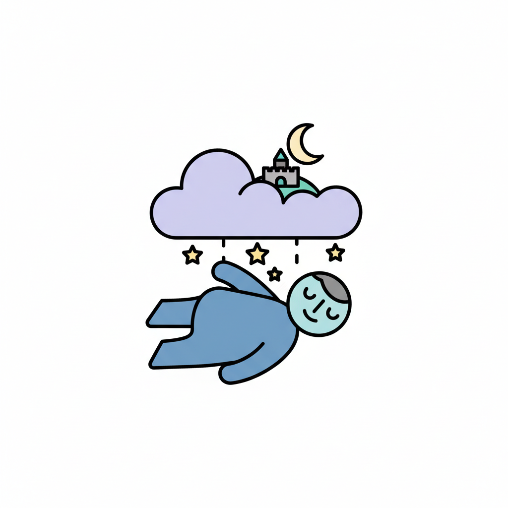 Ein schlafender Mensch unter einem Wolkenhimmel mit Sternen und einer Burg.