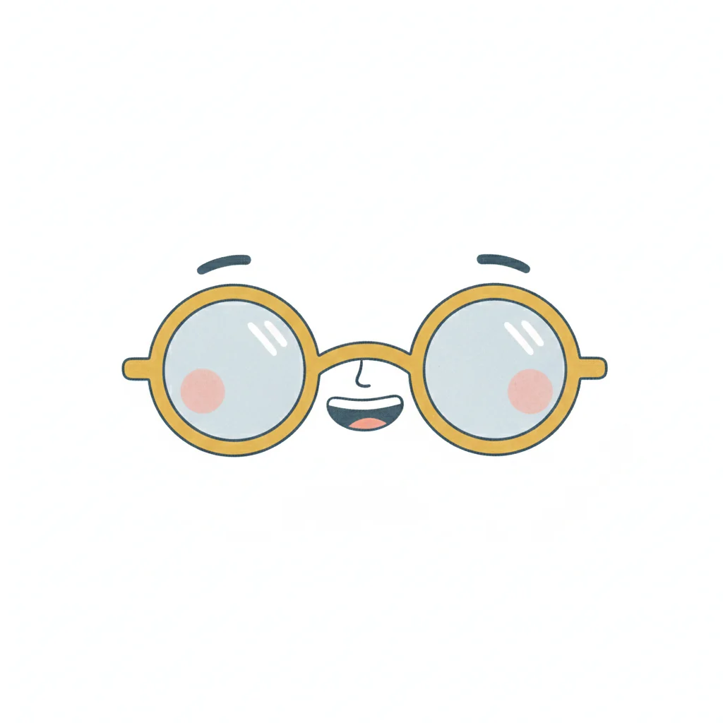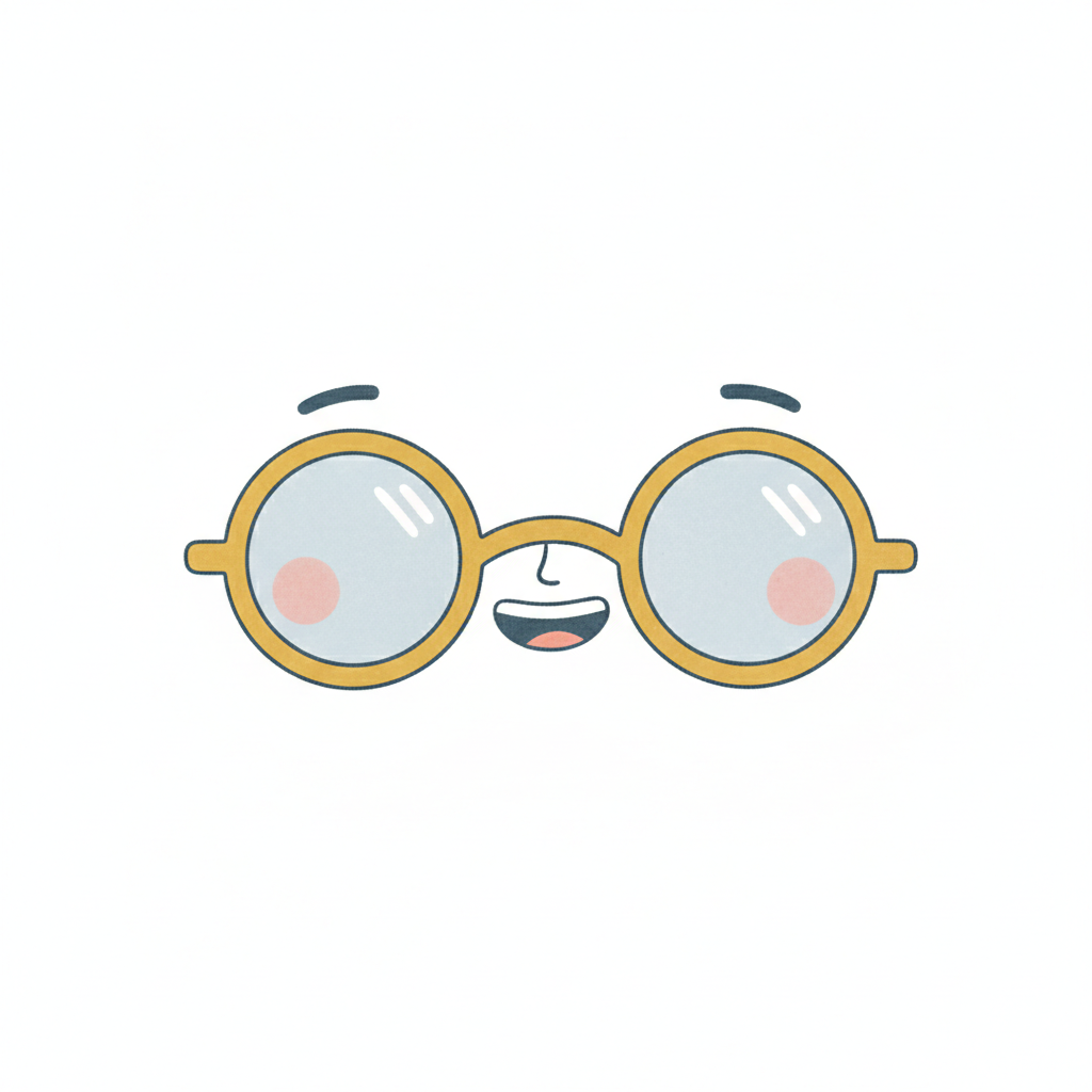 Niedliche Cartoon-Brille mit Gesicht, lächelnd und mit rosafarbenen Wangen auf weißem Hintergrund.