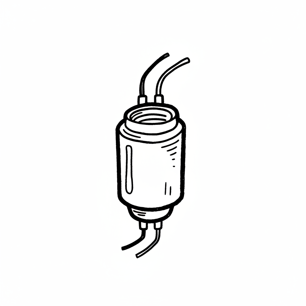 Zylindrisches Bauteil mit Gewindeöffnung und vier Anschlüssen, gezeichnet in Schwarz-Weiß.