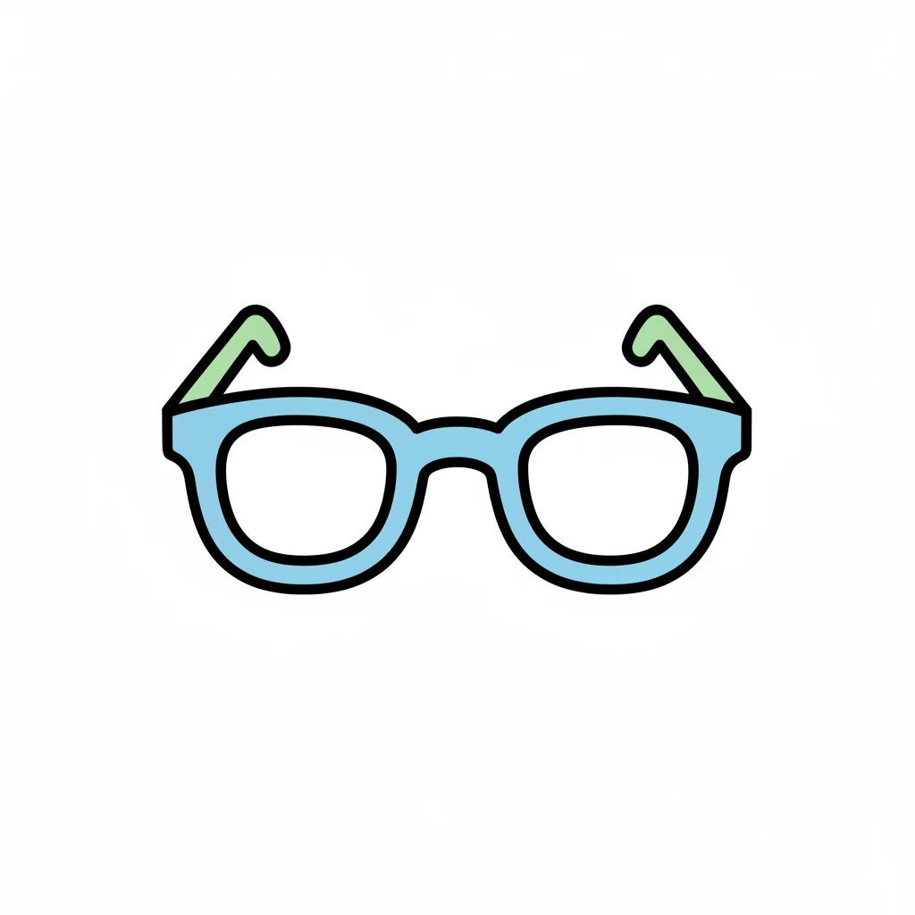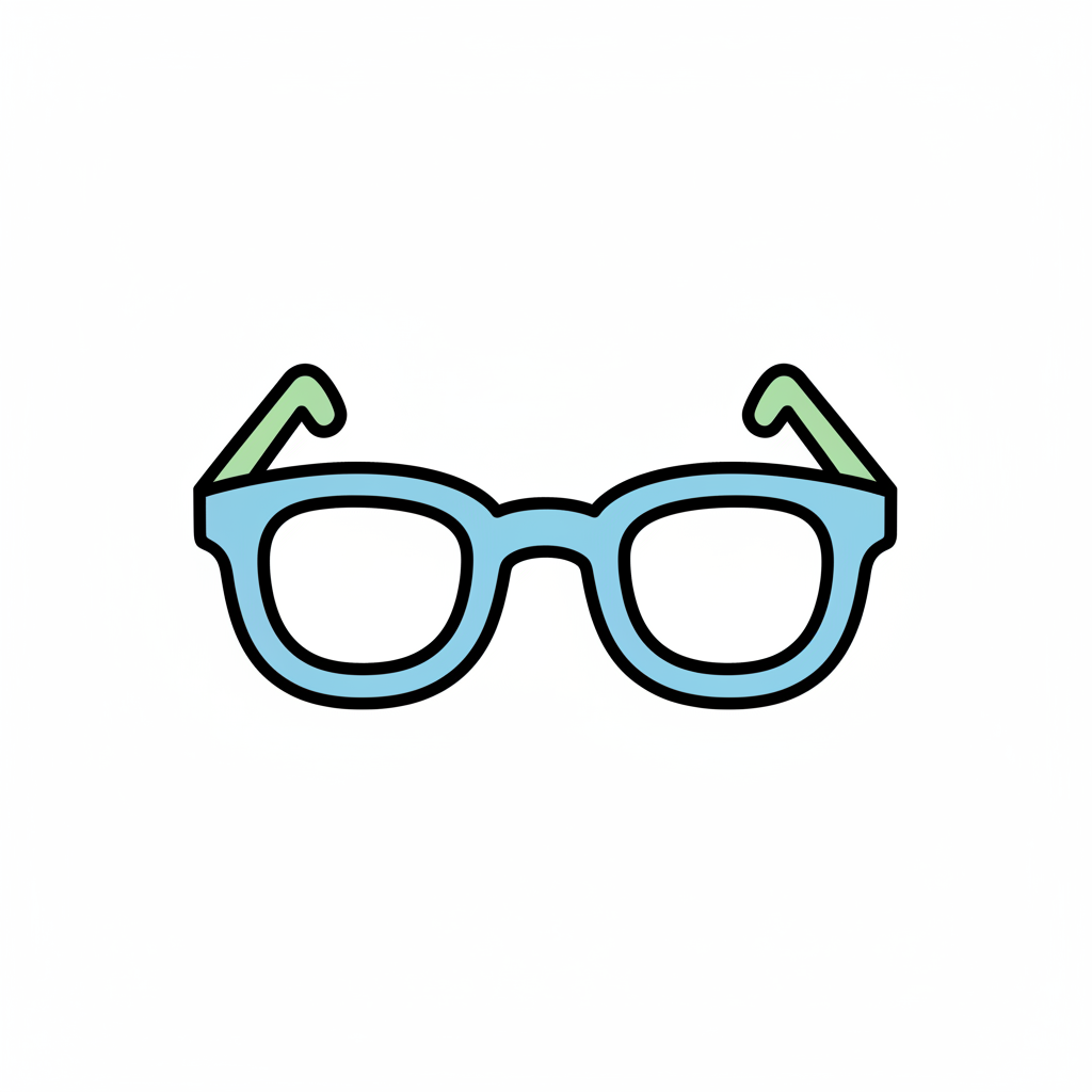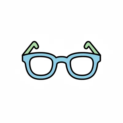 Illustration einer Brille mit hellblauem Rahmen und grünen Bügeln auf weißem Hintergrund.