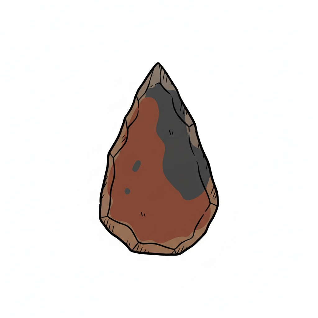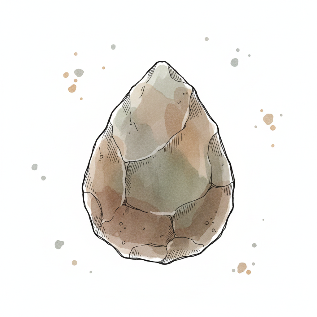 Illustration eines prähistorischen Faustkeils in Braun- und Grautönen auf weißem Hintergrund.