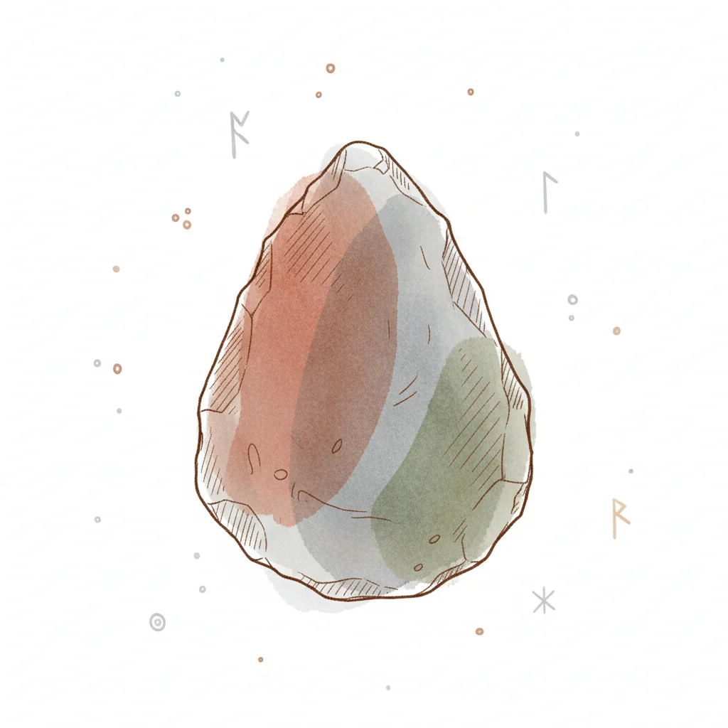 Aquarell-Illustration eines prähistorischen Faustkeils mit Runen und Punkten im Hintergrund.