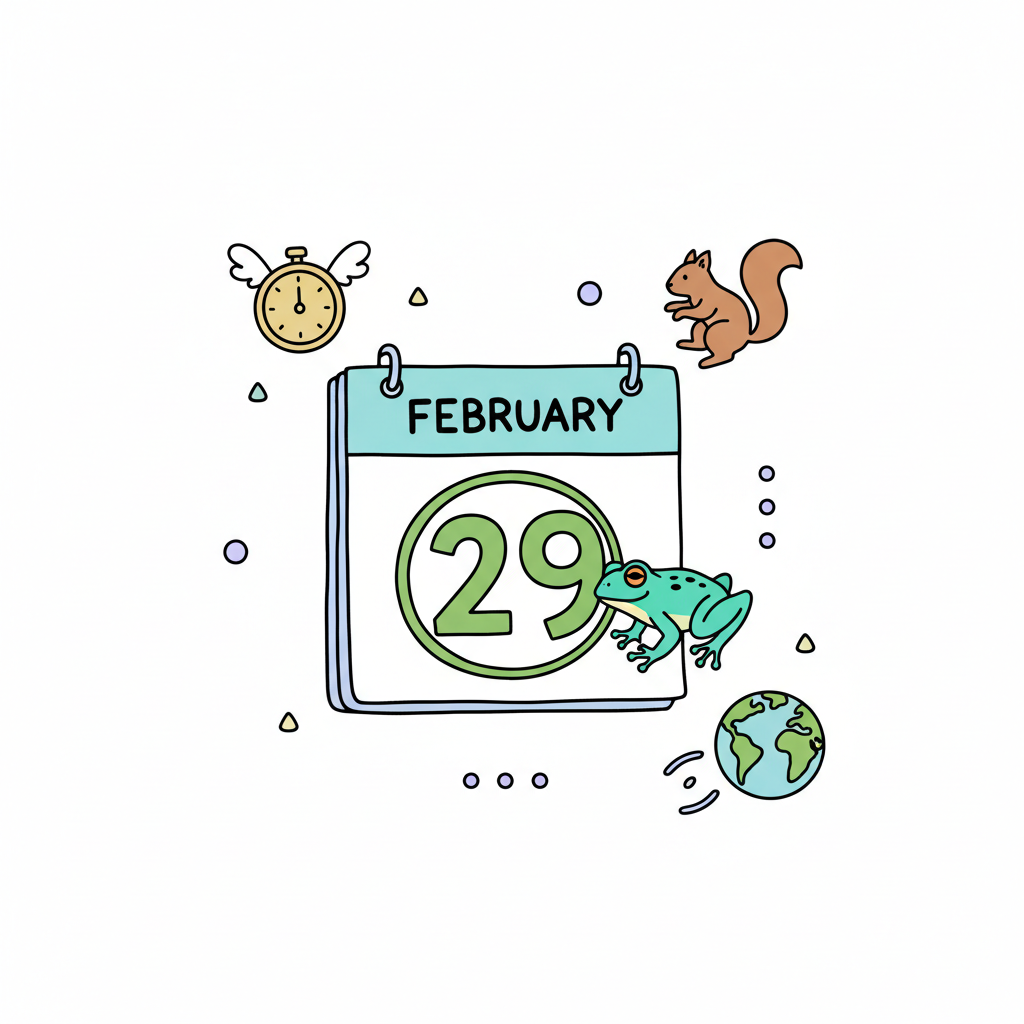 Illustration zum Schalttag: Kalenderblatt 29. Februar mit Frosch, Eichhörnchen, Uhr und Erde.