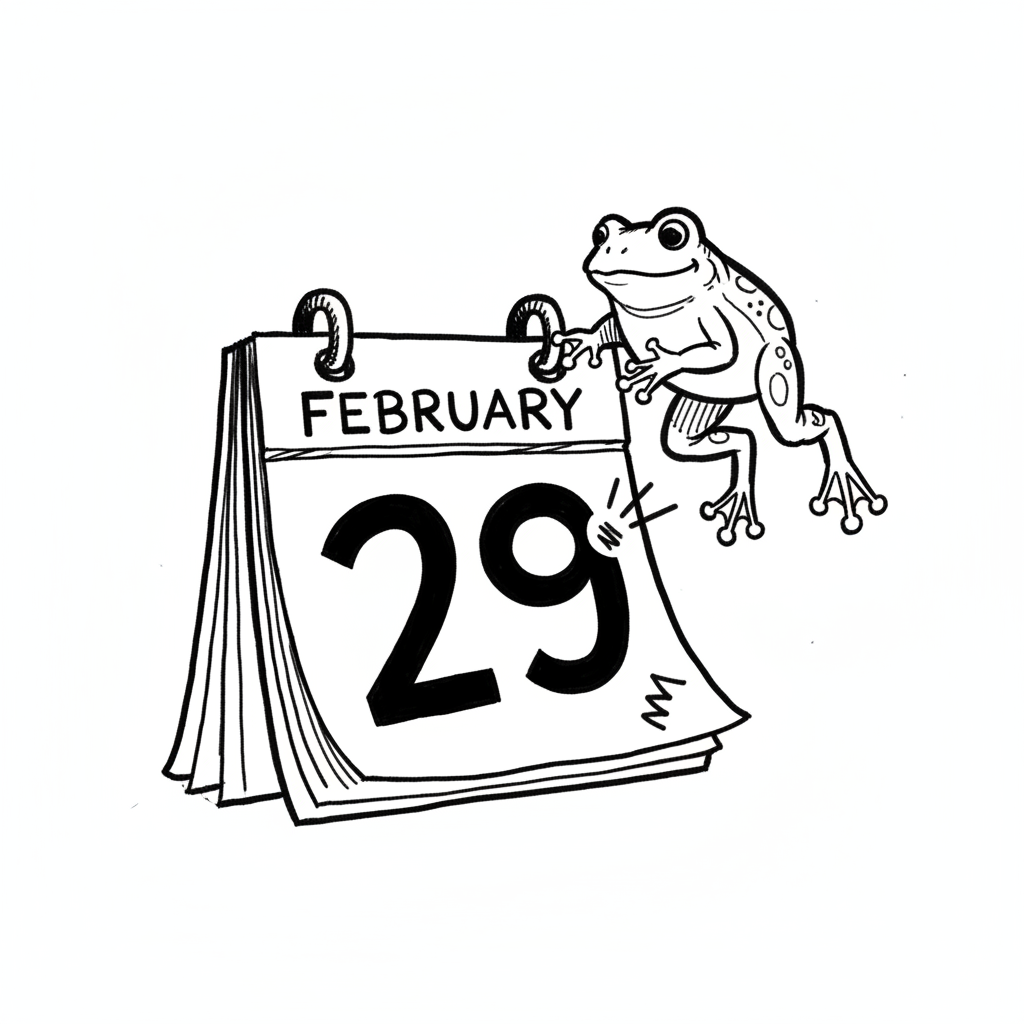 Fröhlicher Frosch auf einem Kalenderblatt, das den 29. Februar anzeigt.