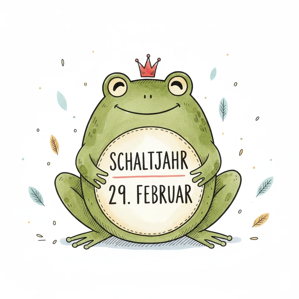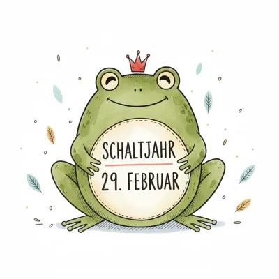 Ein lächelnder Frosch mit Krone präsentiert ein Schild mit "Schaltjahr 29. Februar".