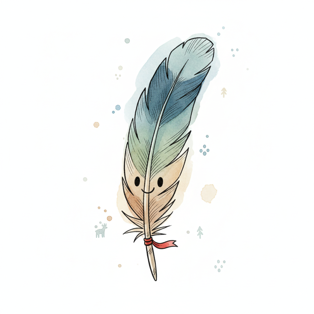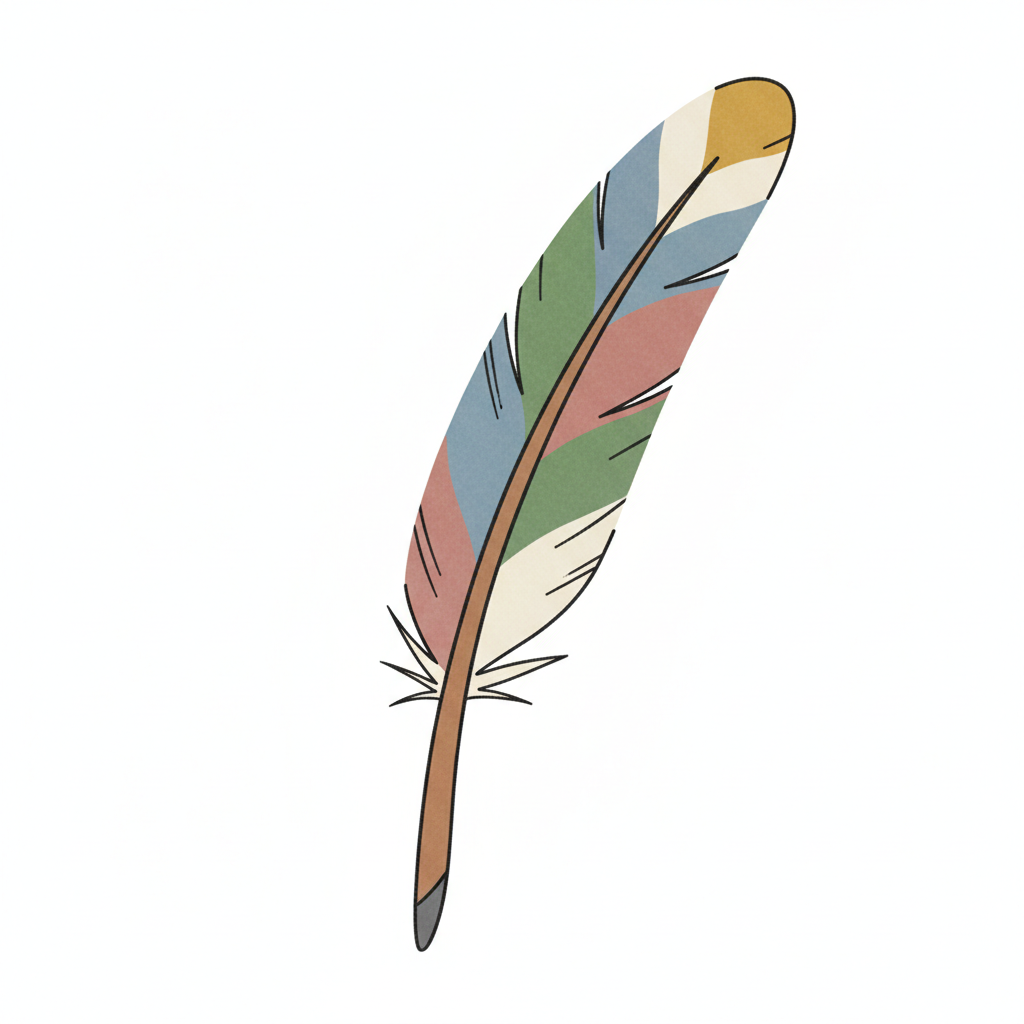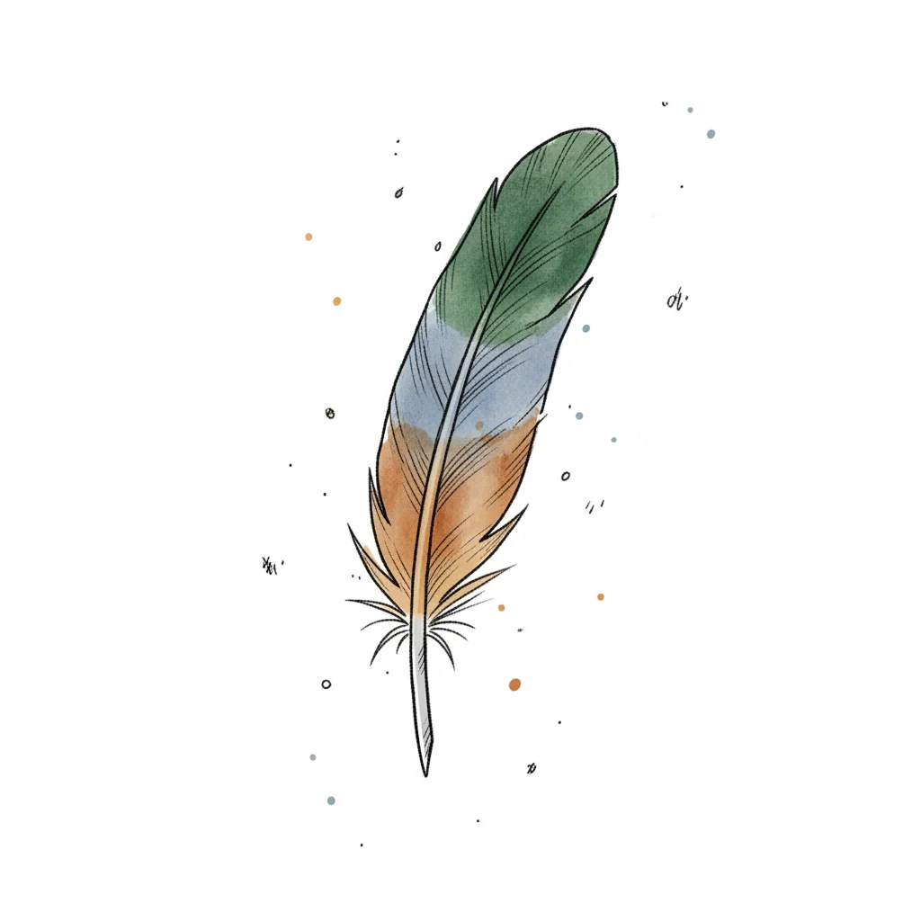 Eine bunte, illustrierte Feder mit verschiedenen Farbfeldern auf weißem Hintergrund.