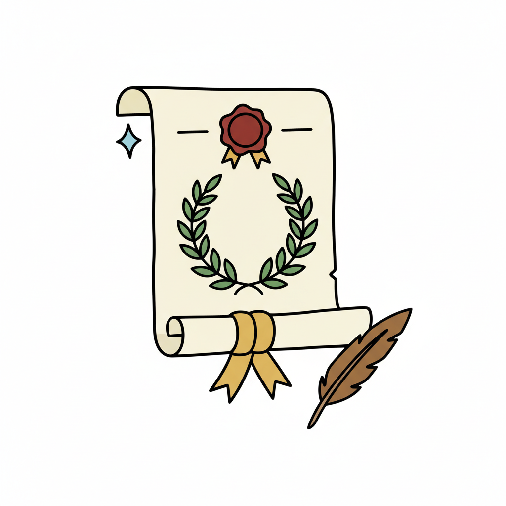 Eine gerollte Urkunde mit Wachssiegel, Lorbeerkranz und Federkiel in Cartoon-Stil.