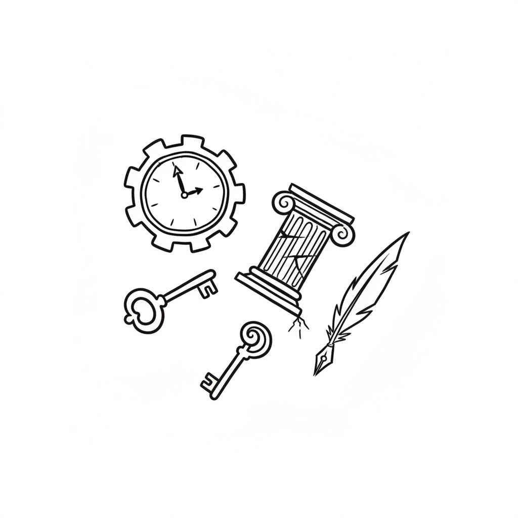 Schwarz-weiße Skizze von Uhr, zerbrochener Säule, zwei Schlüsseln und Federkiel.