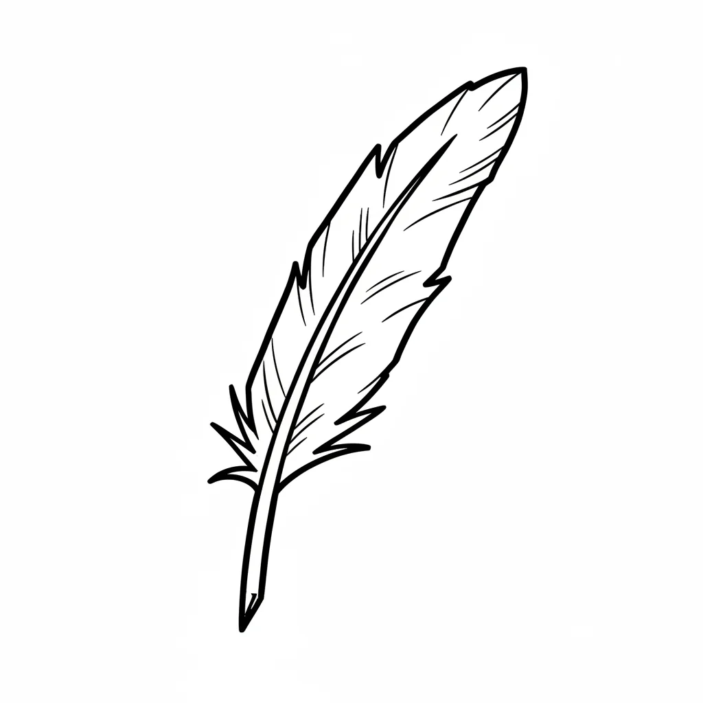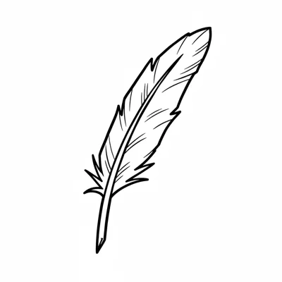 Schwarz-weiße Strichzeichnung einer einzelnen Feder auf weißem Hintergrund.