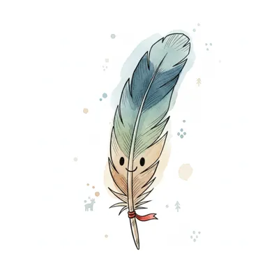 Niedliche Aquarellfeder mit lächelndem Gesicht und rotem Band auf hellem Hintergrund.