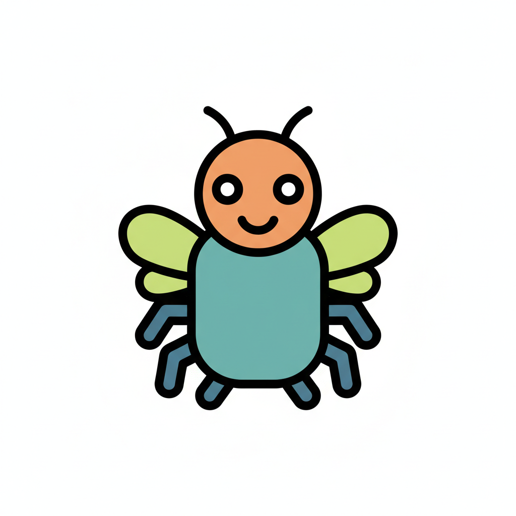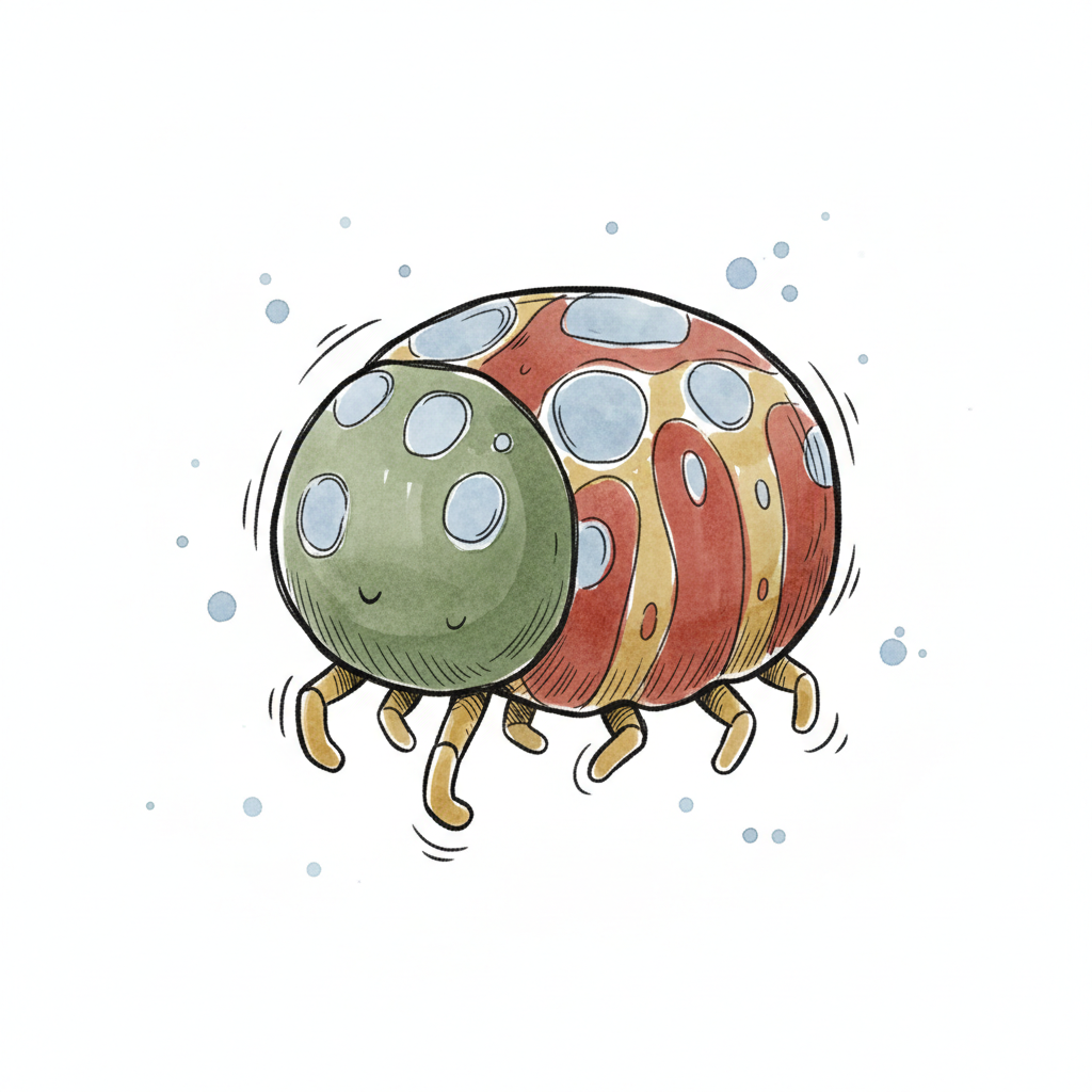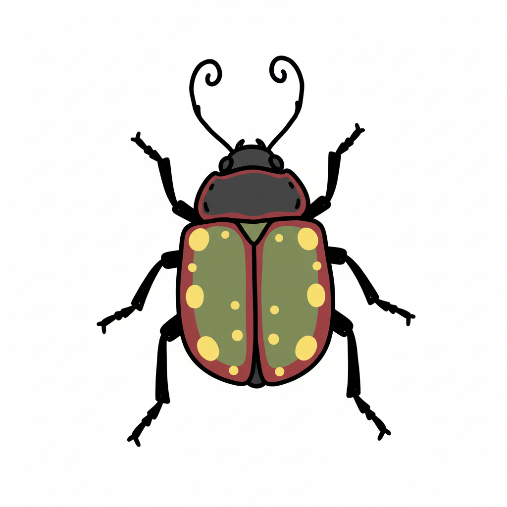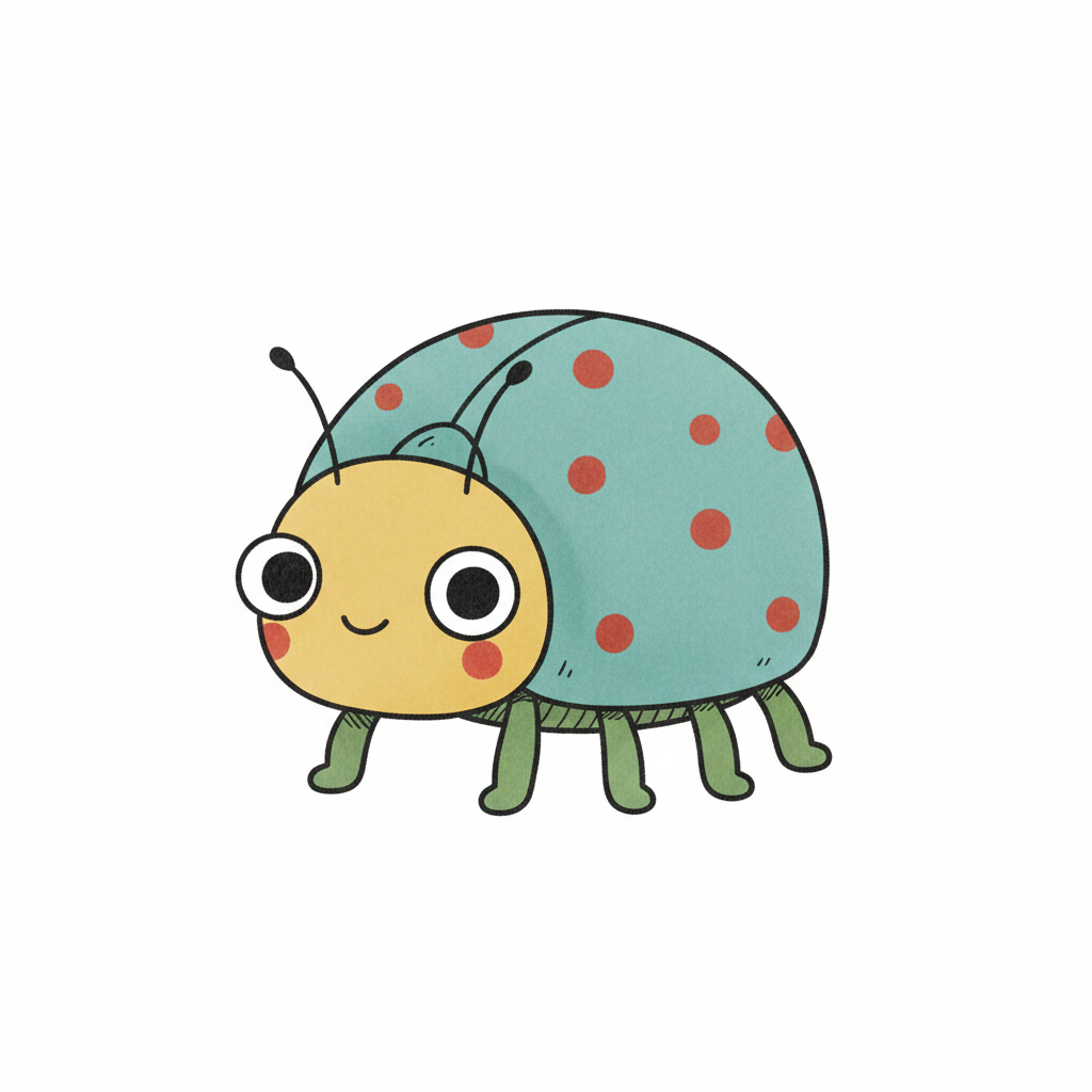 Niedlicher Cartoon-Käfer mit gelbem Kopf, großen Augen und blaugrünem Körper mit roten Punkten.