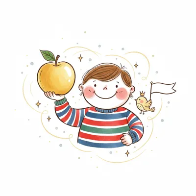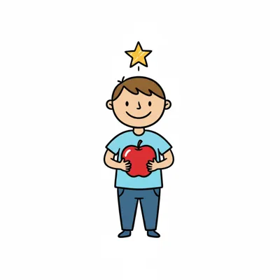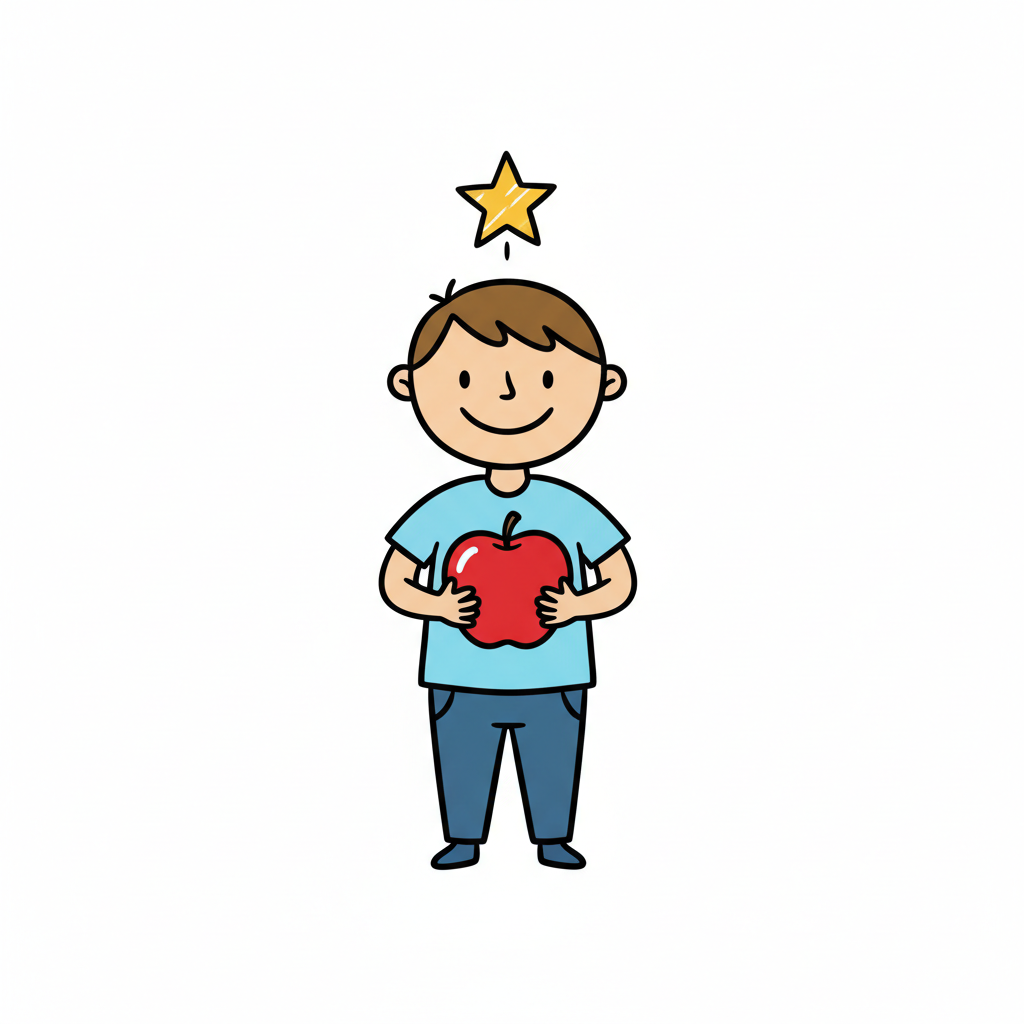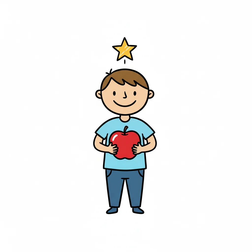 Ein lächelnder Cartoon-Junge hält einen roten Apfel, mit einem Stern über seinem Kopf.