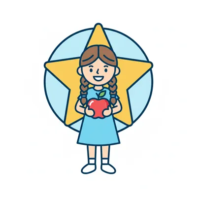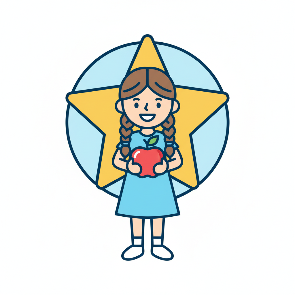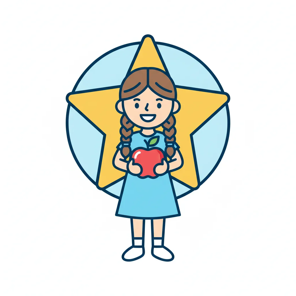 Lächelndes Cartoon-Mädchen mit Zöpfen hält einen roten Apfel vor einem gelben Stern und blauem Kreis.