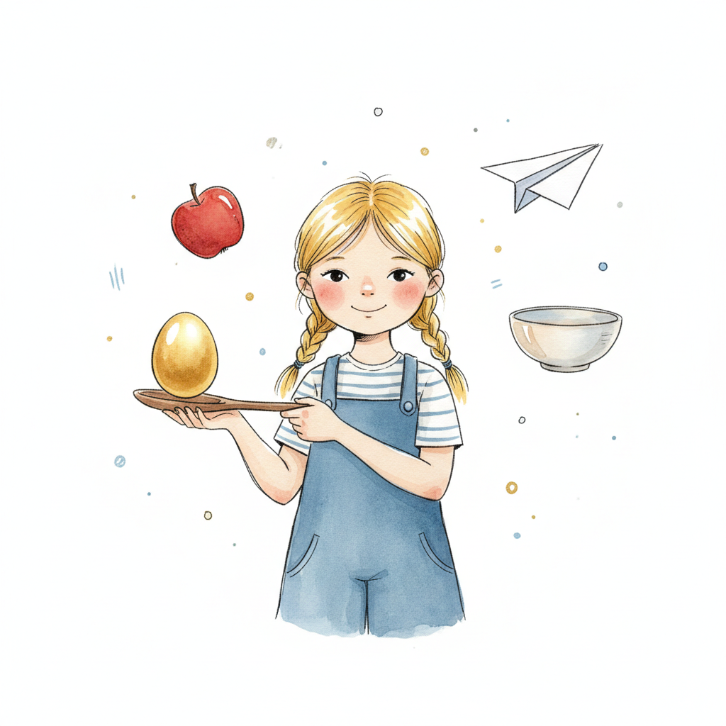 Fröhliches Mädchen hält goldenes Ei auf Löffel, umgeben von Apfel, Papierschiff und Schale.