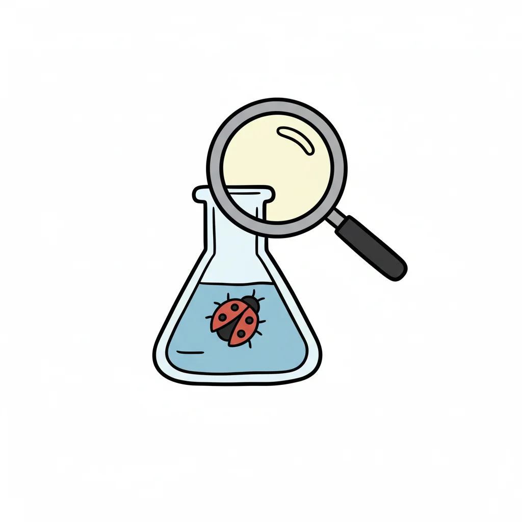 Lupe über Erlenmeyerkolben mit Marienkäfer, symbolisiert Fehlersuche oder Debugging.