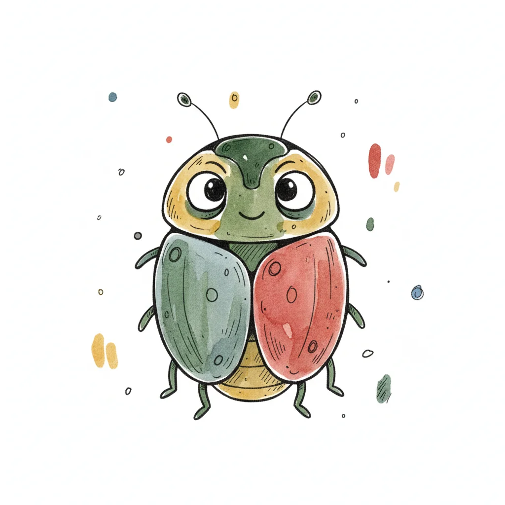 Niedlicher, bunter Käfer im Aquarellstil mit großen Augen und farbigen Punkten.