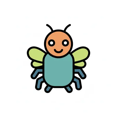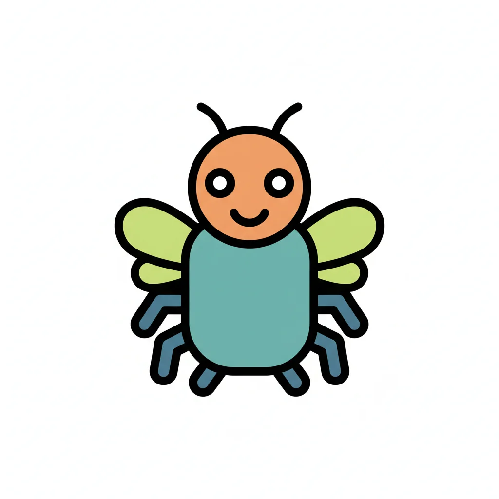 Niedliches, farbenfrohes Cartoon-Insekt mit lächelndem Gesicht und Flügeln auf weißem Hintergrund.