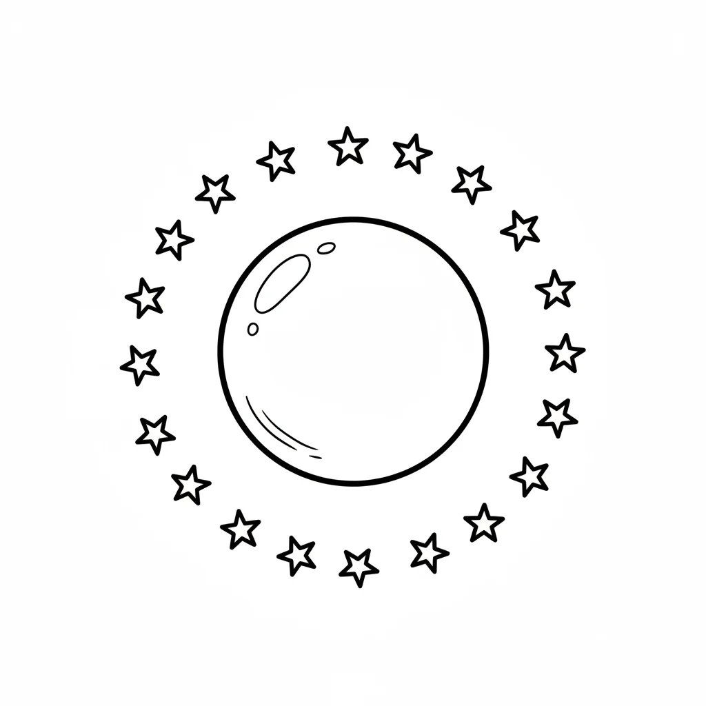 Schwarz-weiße Strichzeichnung eines Himmelskörpers, umgeben von einem Kreis aus Sternen.
