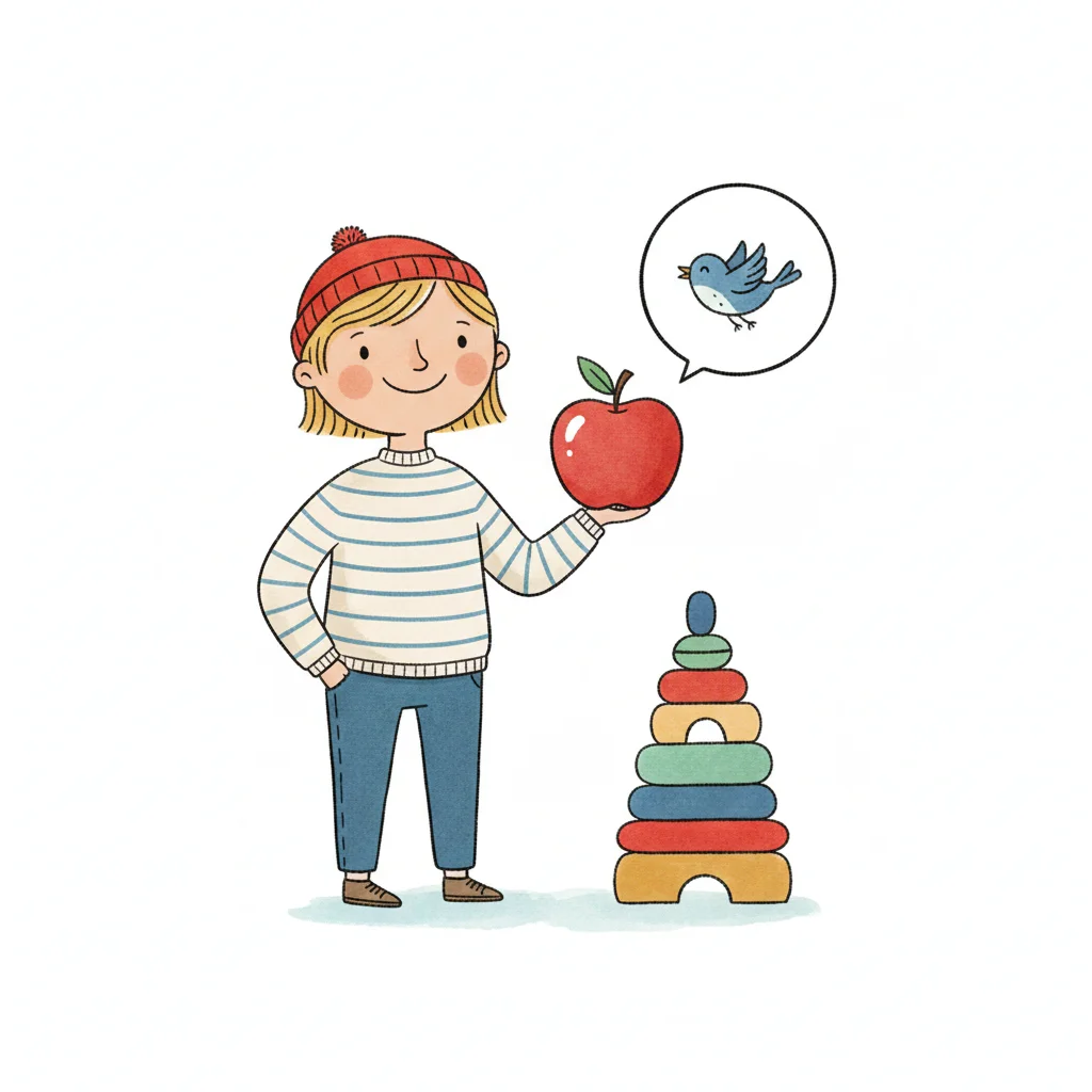 Fröhliches Kind mit Apfel, Vogelgedanken und Stapelturm. Bunte, kinderfreundliche Illustration.