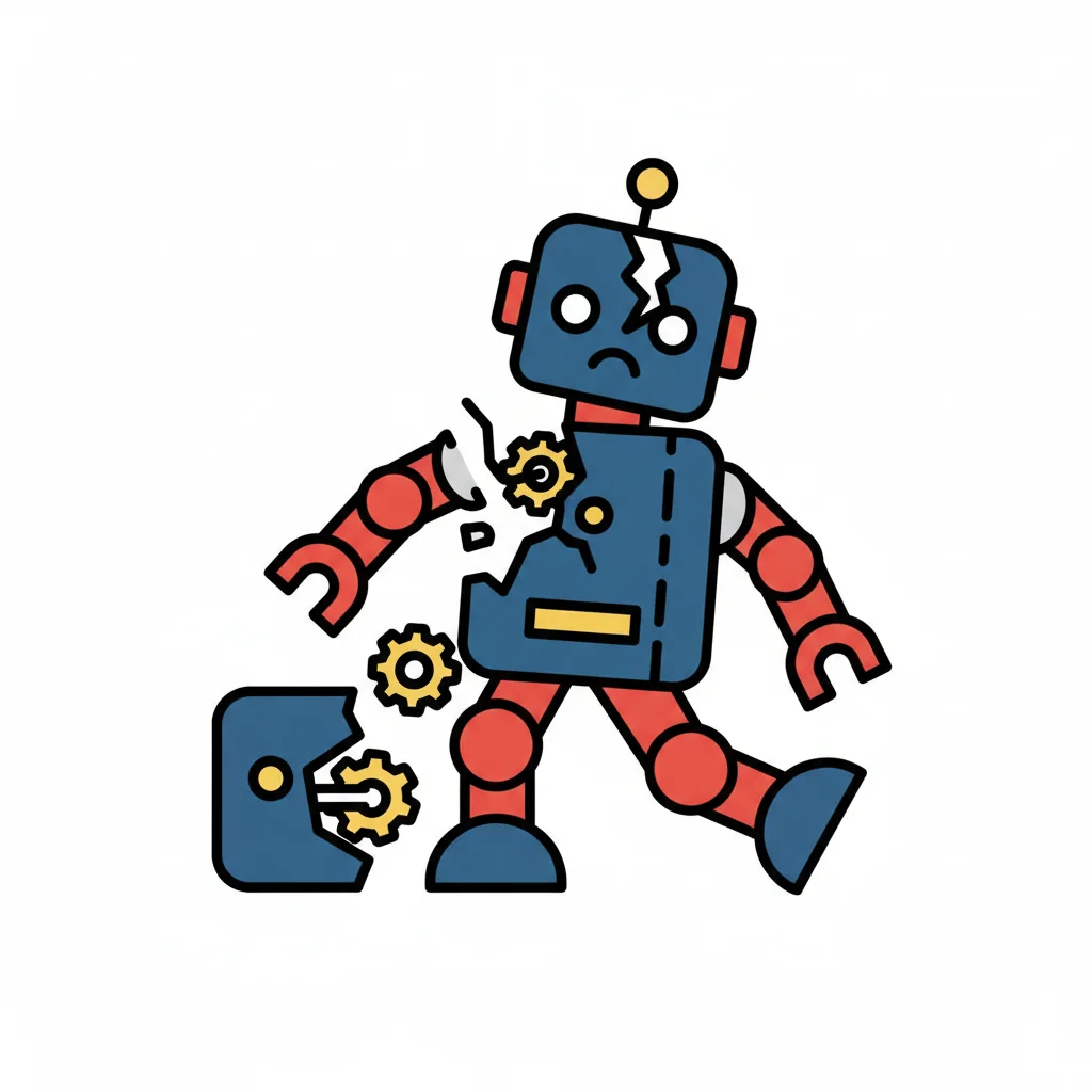Kaputter Roboter mit Rissen, fehlendem Arm und herausfallenden Zahnrädern.