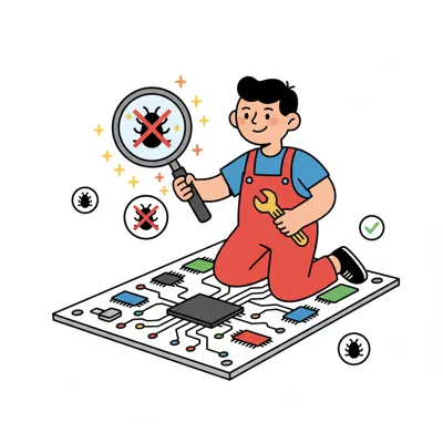 Ein Techniker behebt Bugs auf einer Platine mit Lupe und Schraubenschlüssel.