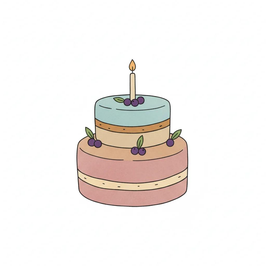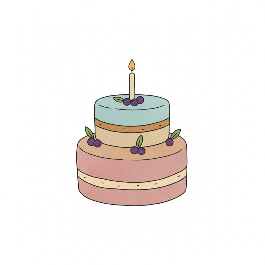 Bunter mehrstöckiger Kuchen mit Kerze und Beerenverzierung.