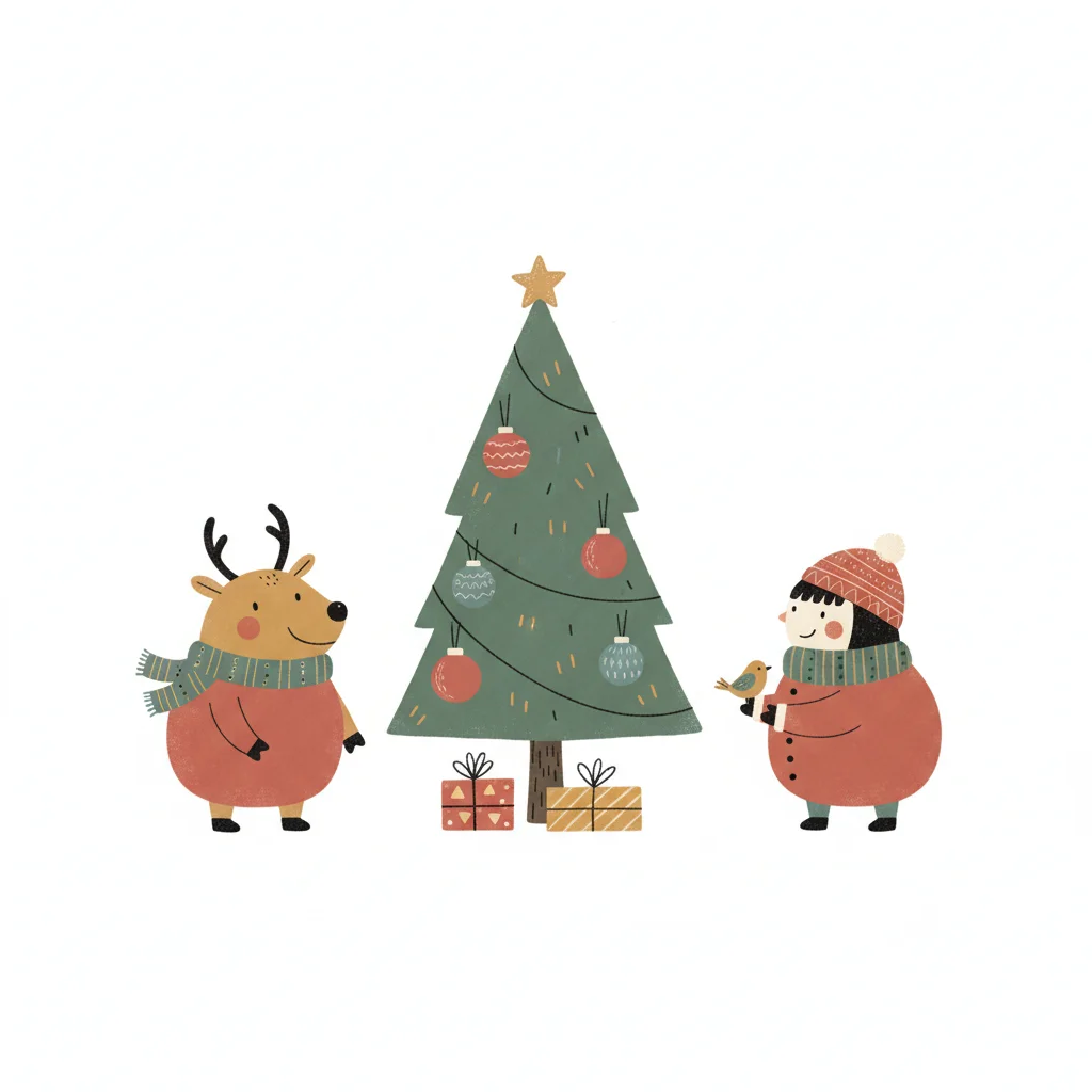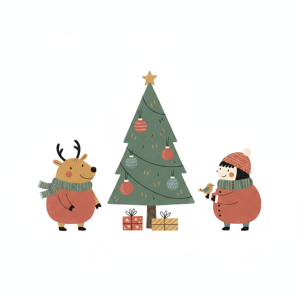 Ein Rentier und eine Person feiern Weihnachten vor einem geschmückten Baum.