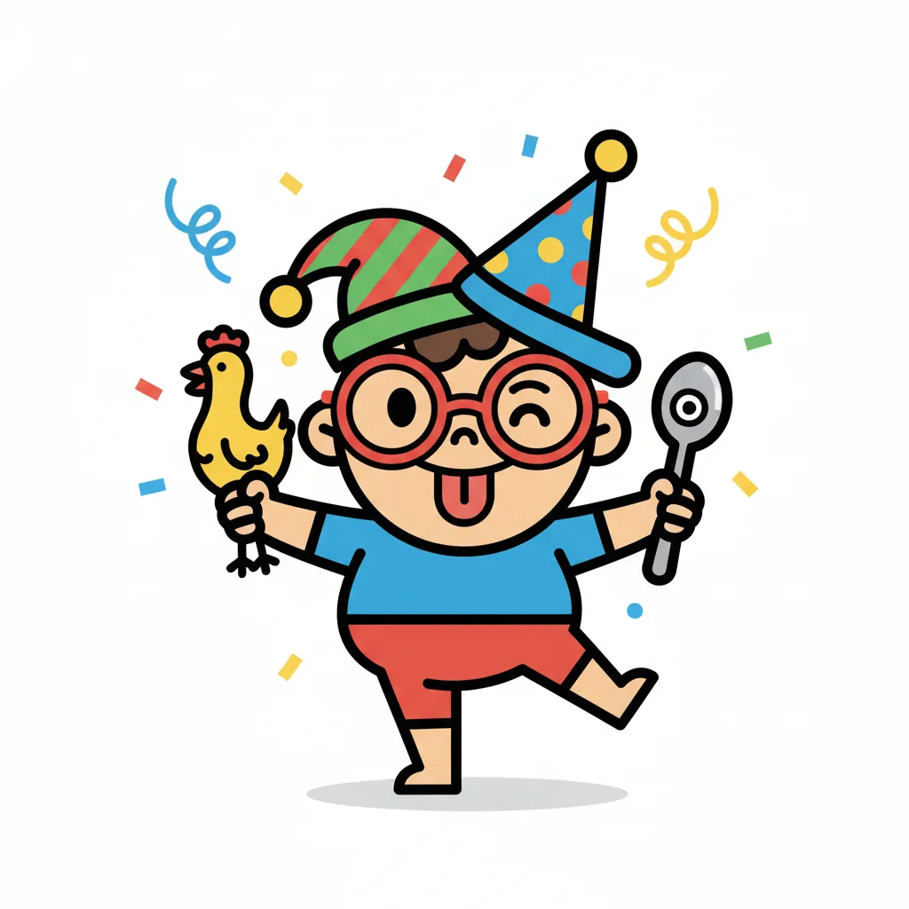 Kind mit Partyhut, Hähnchen und Löffel feiert fröhlich.