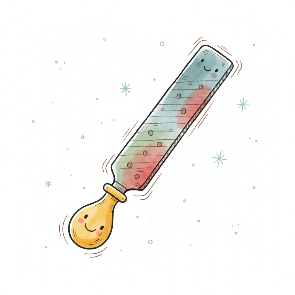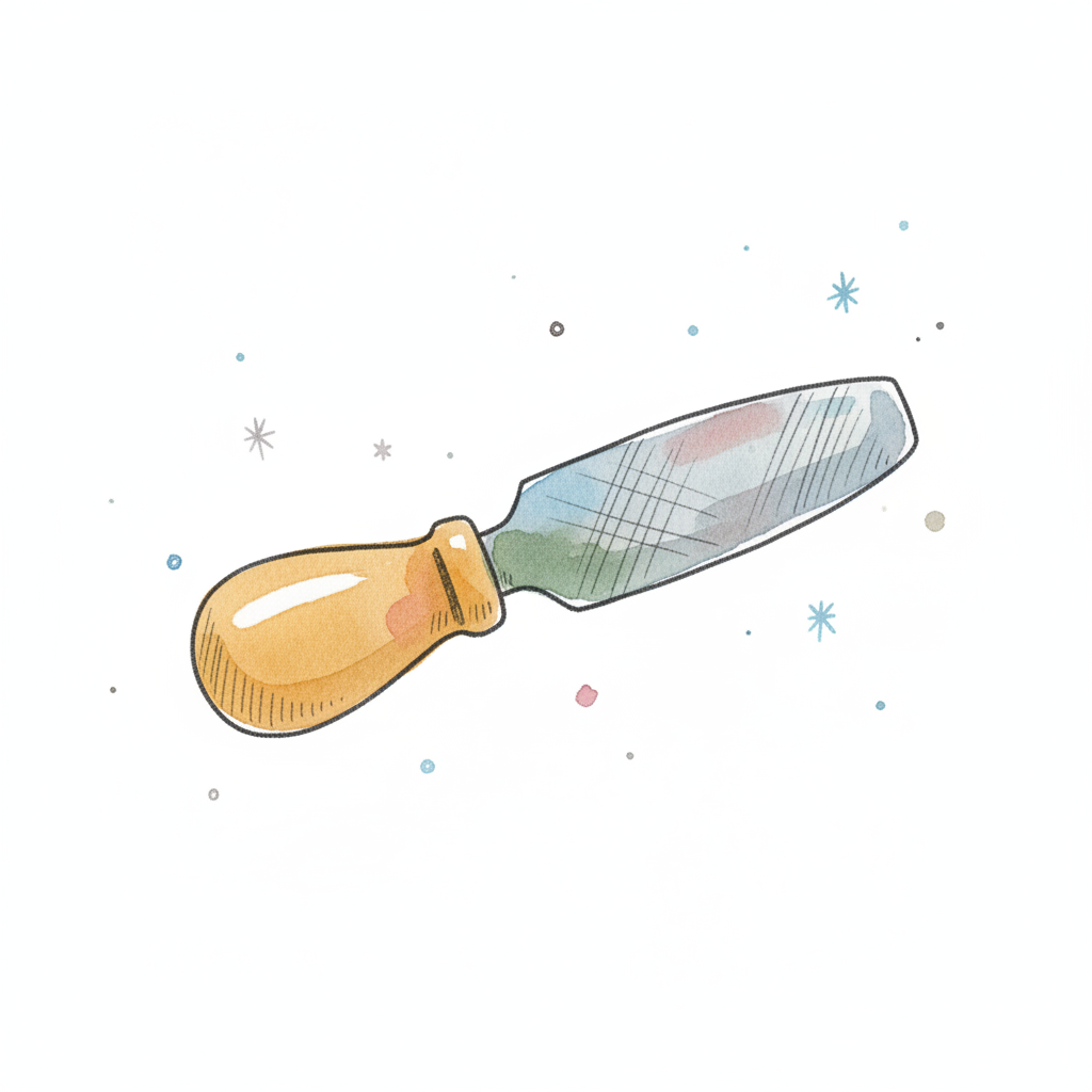 Aquarell-Illustration einer Feile mit Holzgriff auf weißem Hintergrund mit bunten Sprenkeln.