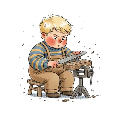 Ein kleiner Junge feilt konzentriert an einem Holzstück, das in einem Schraubstock eingespannt ist.