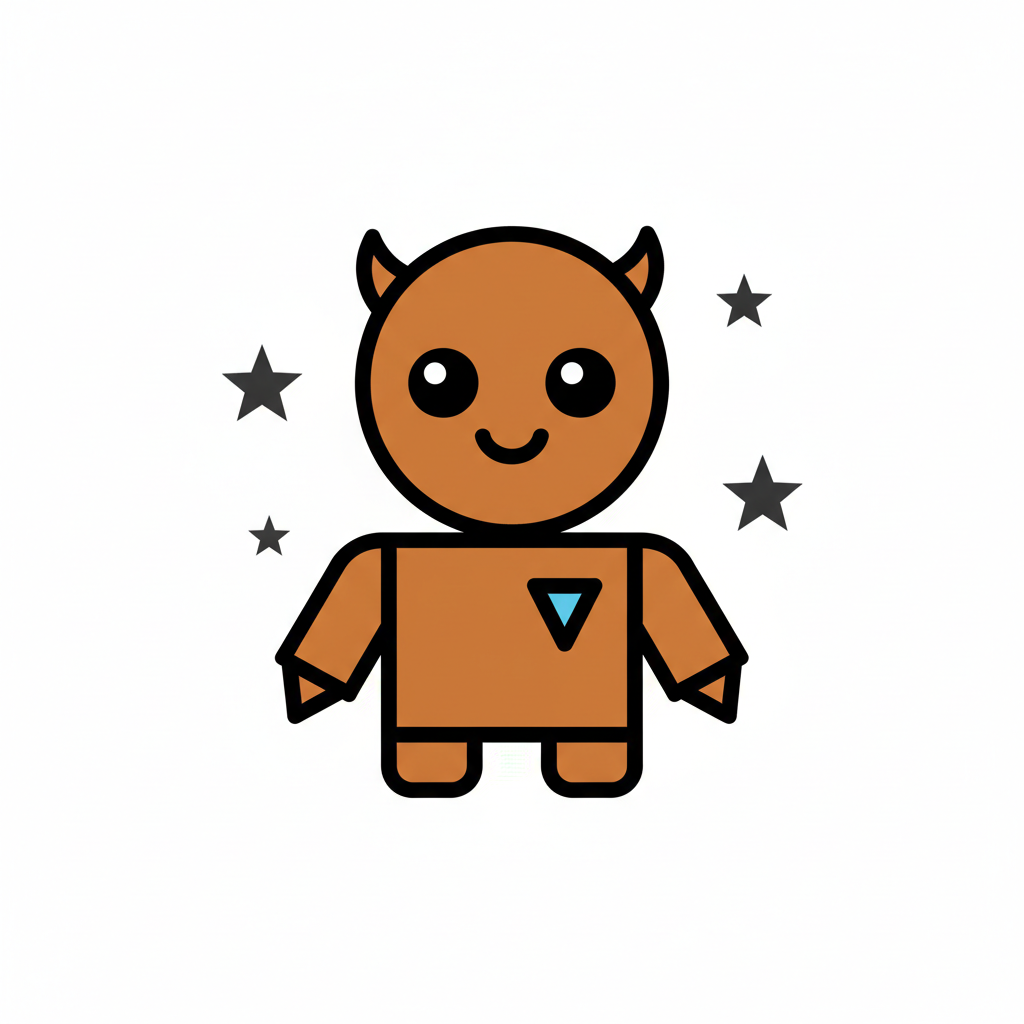 Niedliche braune Cartoon-Figur mit Hörnern, großen Augen und Sternen, lächelnd auf weißem Hintergrund.