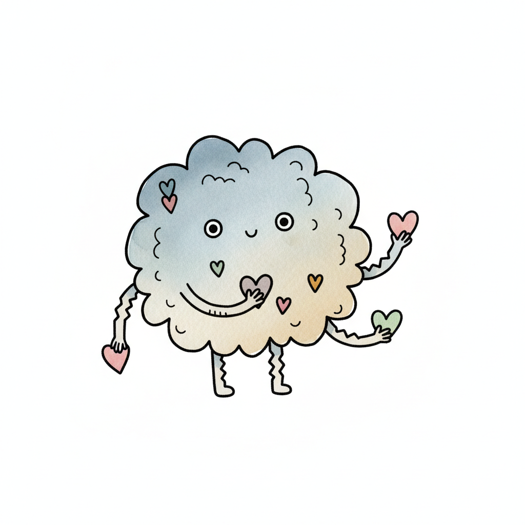 Niedliche Wolkenfigur mit Armen und Beinen, die Herzen hält und verteilt.