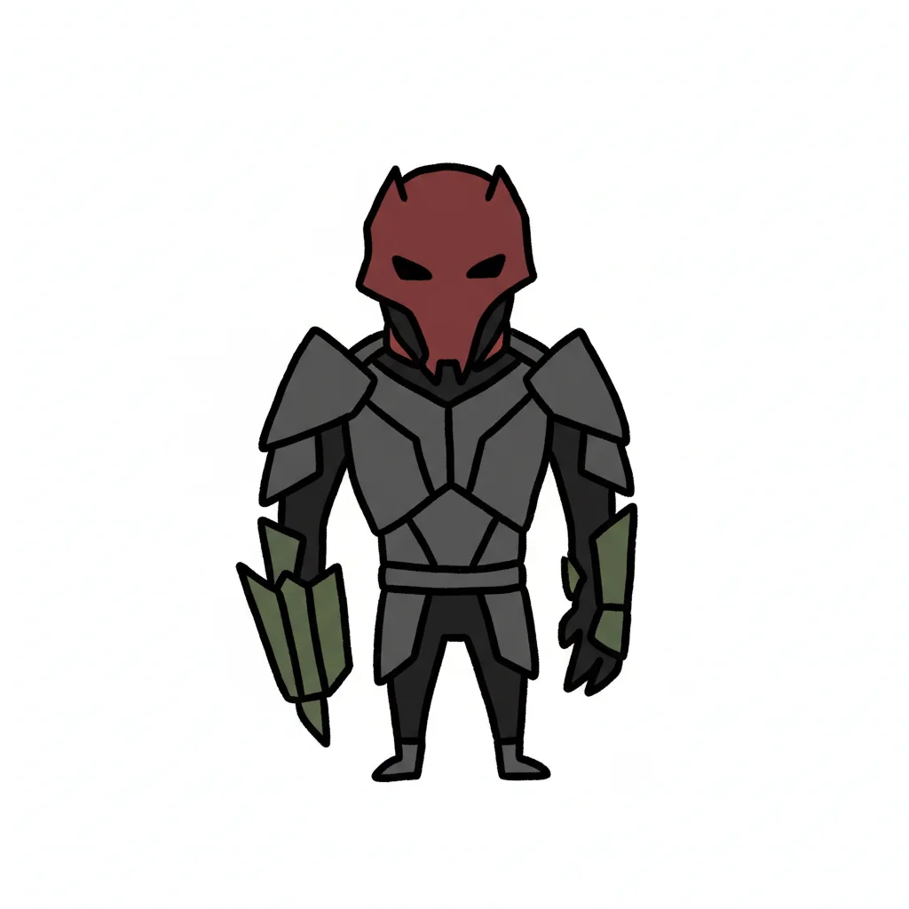 Stilisierte Figur in grauer Rüstung mit rotem Helm und grüner Klinge, weißer Hintergrund.