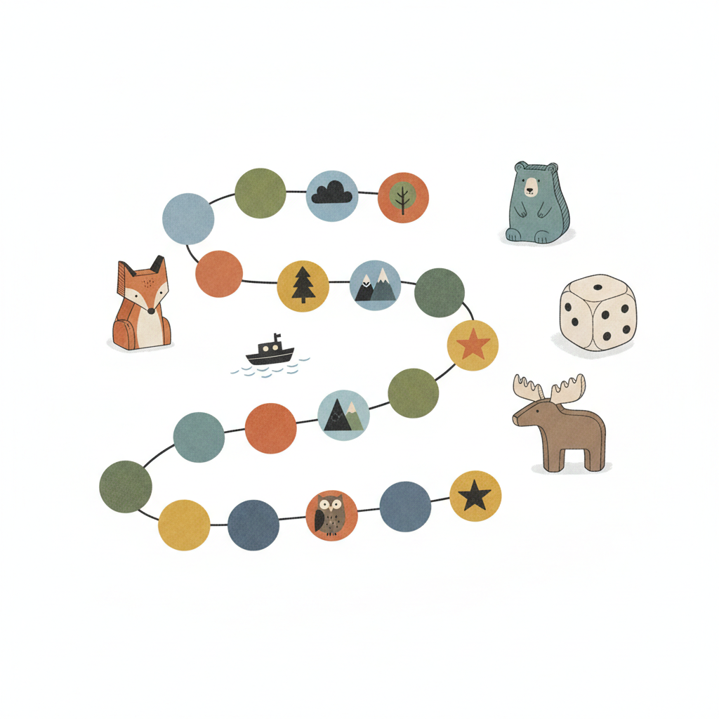 Buntes Brettspiel mit Tierfiguren (Fuchs, Bär, Elch), Würfel und Naturmotiven auf den Feldern.