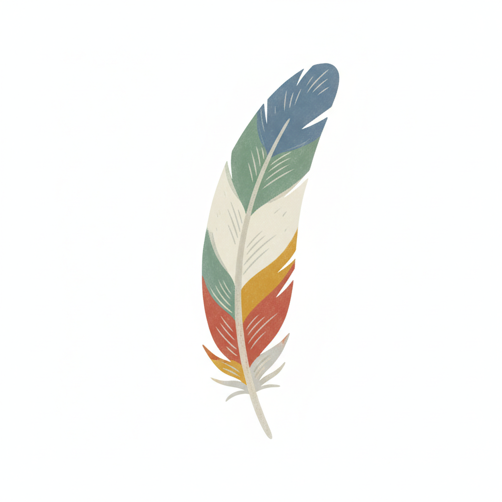 Eine bunte, illustrierte Feder mit verschiedenen Farbfeldern auf weißem Hintergrund.