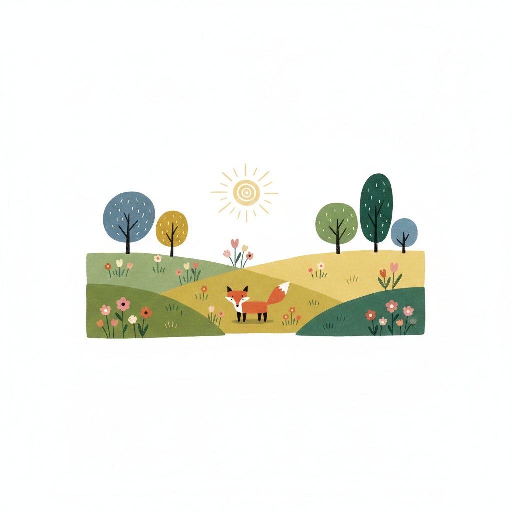 Niedliche Illustration eines Fuchses in einer frühlingshaften Hügellandschaft mit Bäumen und Blumen.