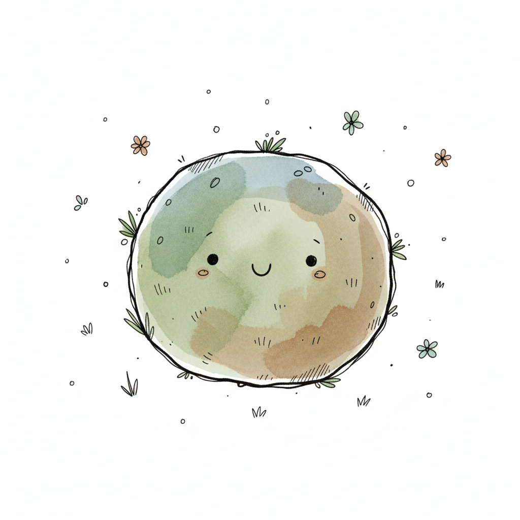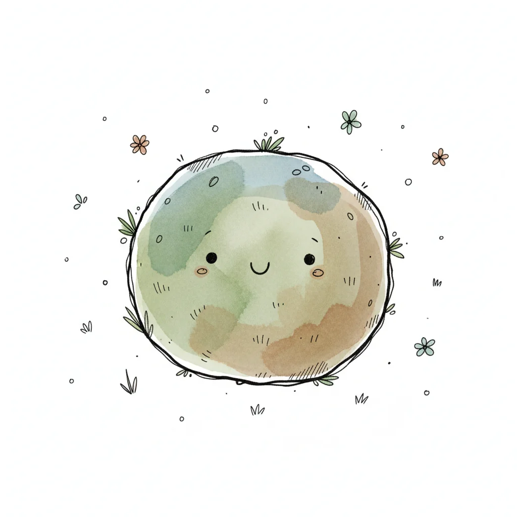 Niedliche, lächelnde Cartoon-Erde mit Blumen und Gras in Aquarell-Optik.