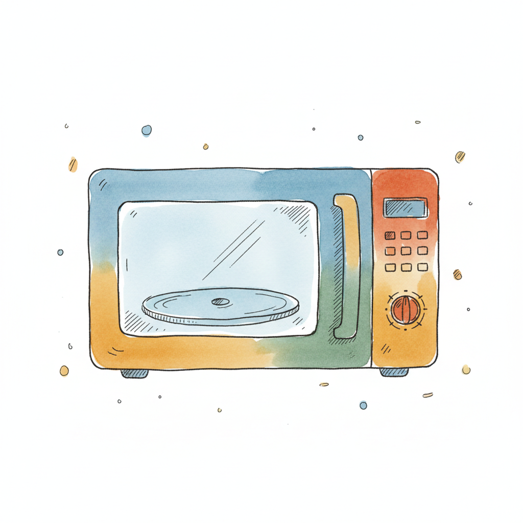 Bunte, handgezeichnete Mikrowelle in Aquarellfarben mit Drehteller und Bedienfeld.
